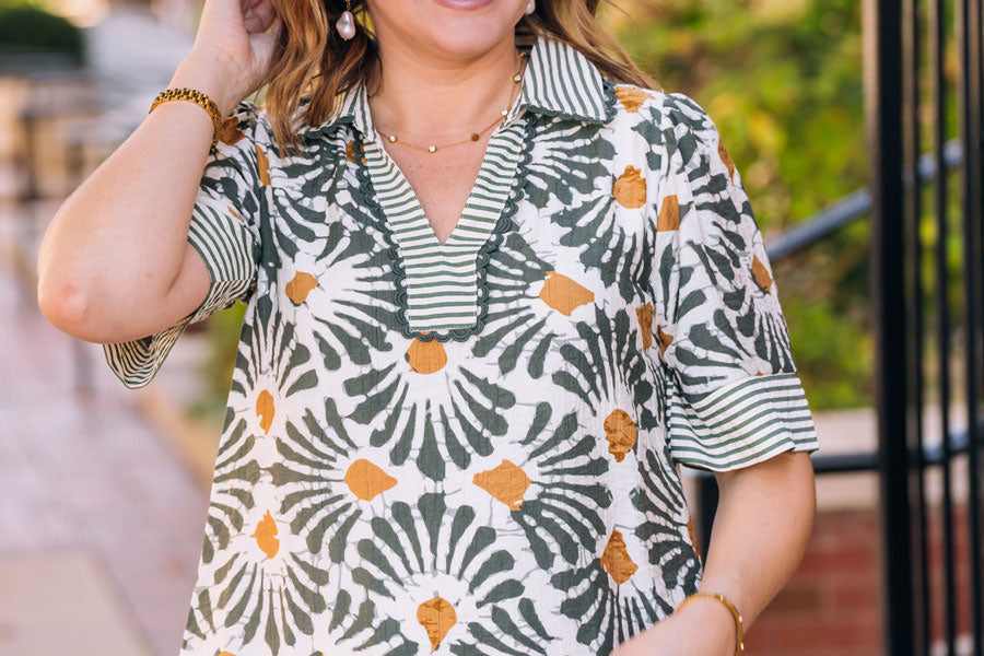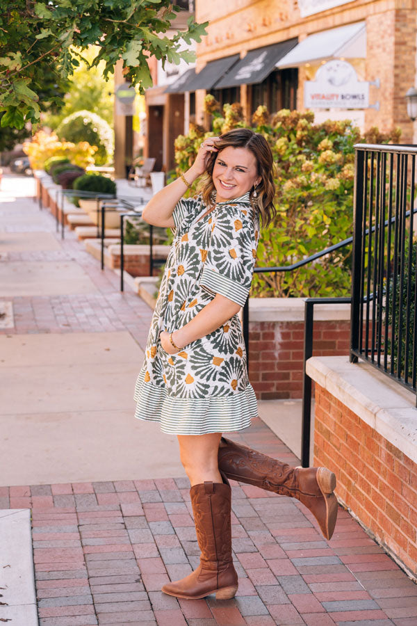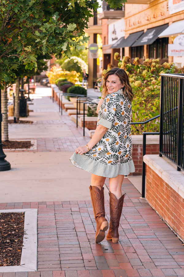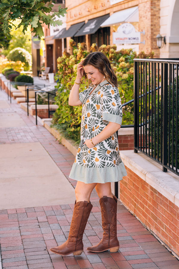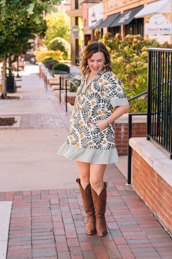 Step into autumn with our These Moments Dress, featuring charming fall florals, and cute striped ruffle hem, and handy pockets. Fully lined for comfort and perfect for transitioning to fall, this playful dress keeps you stylish as the leaves change!