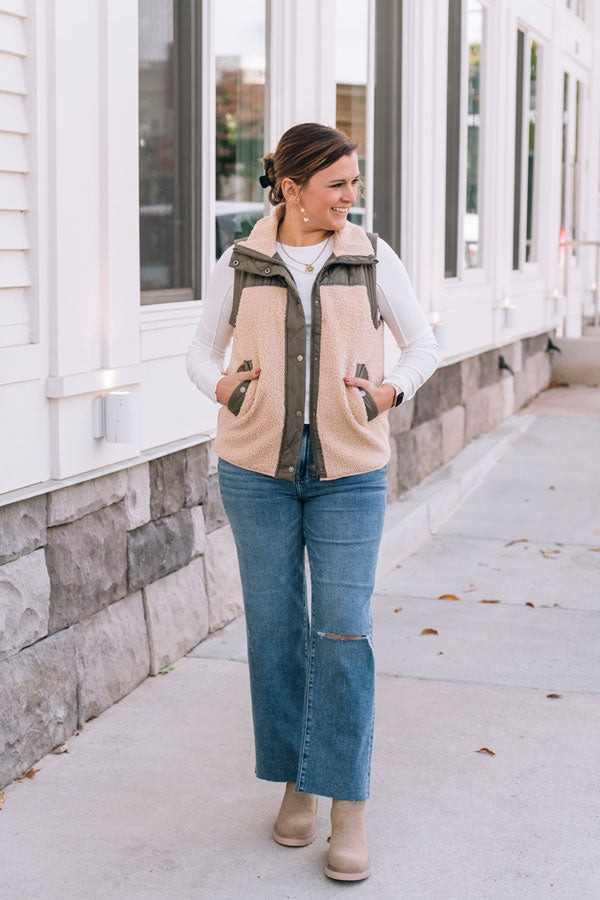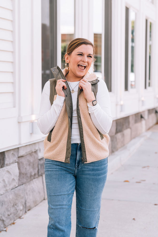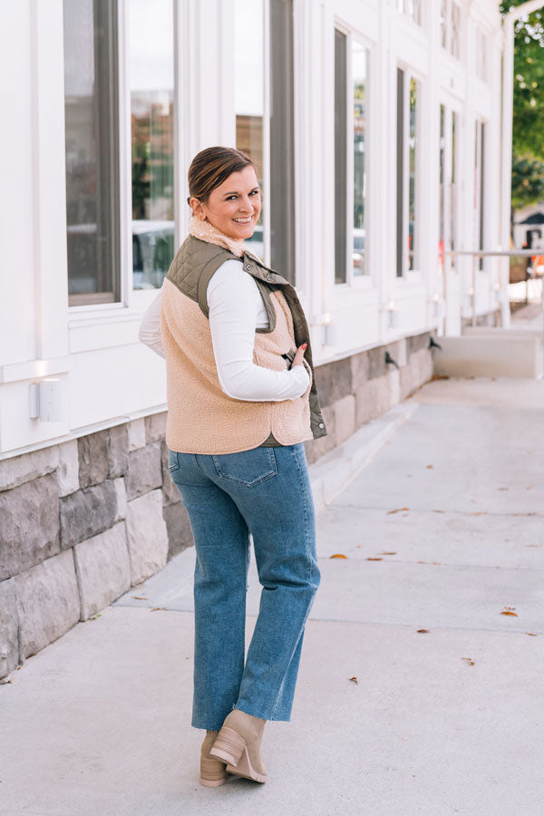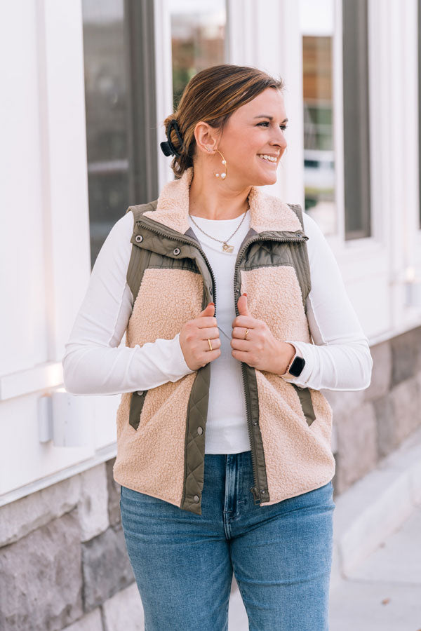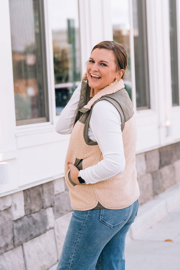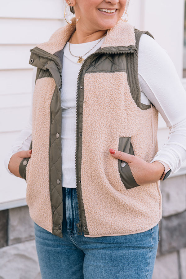 The Mountain Getaway Vest features detailed quilting and plush sherpa for exceptional warmth and texture. Its combination zipper and snap button front ensures secure closure and easy layering. Thoughtfully designed with functional pockets, this vest is perfect for both outdoor adventures and casual wear.