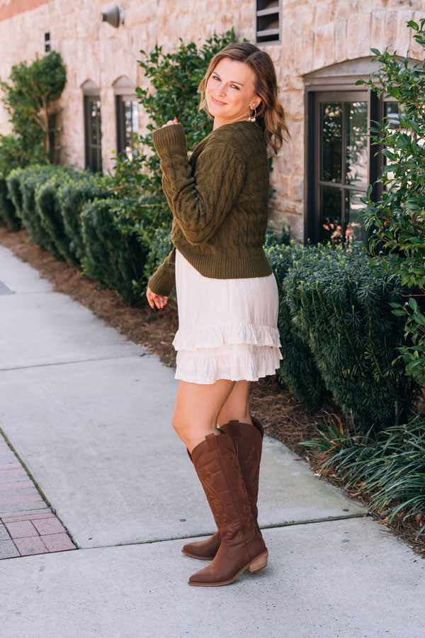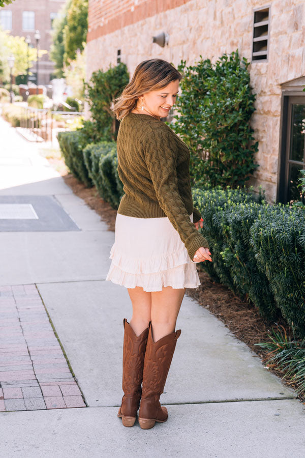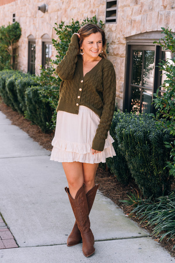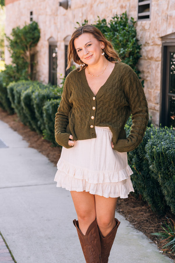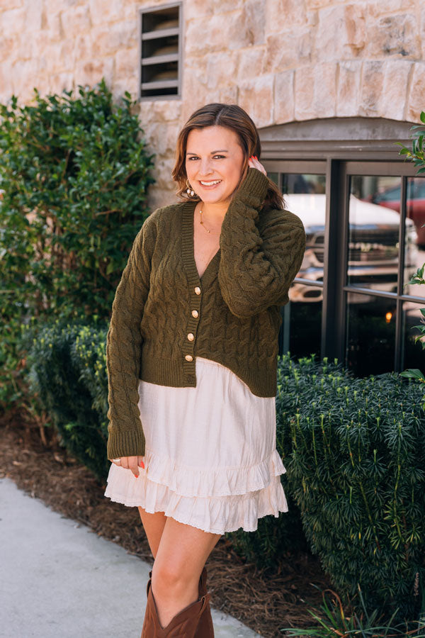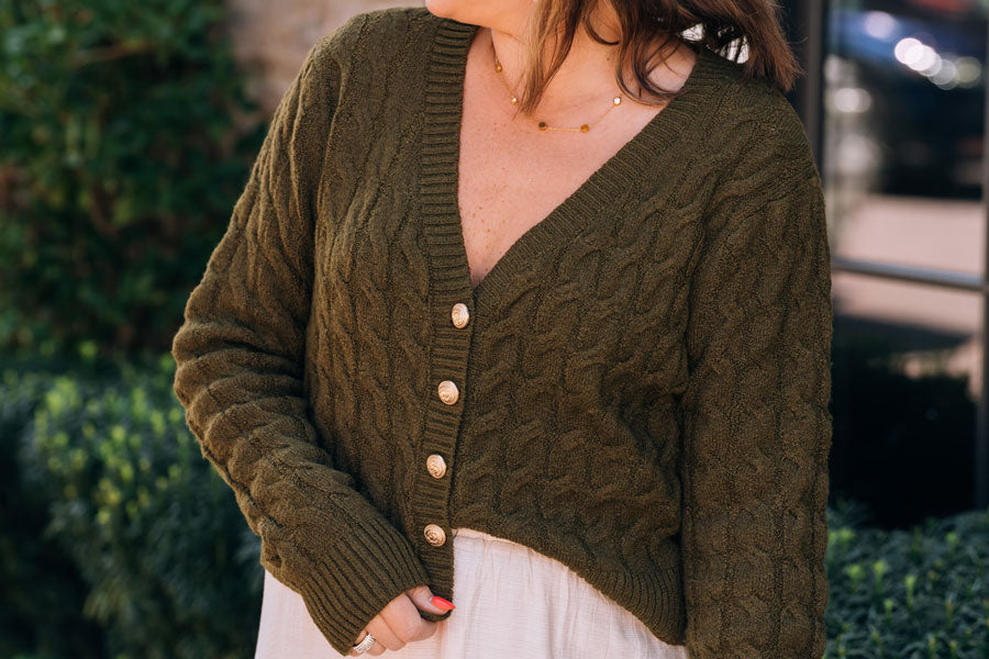 Cozy up with our In the Evergreens Cardigan, where rich olive green meets soft comfort. Featuring charming gold buttons and ribbed cuffs, this cable knit classic adds a playful touch to any outfit. Its versatile design makes it the perfect layering piece. Wear with a fun skirt as shown here for a weekend fit, wear with your favorite jeans for a casual everyday style, or layer over a collared top with trousers for work!