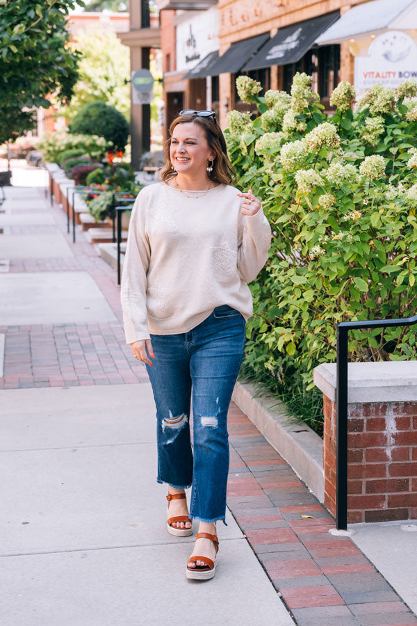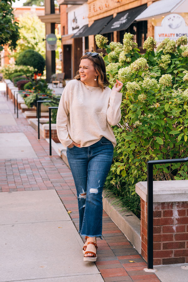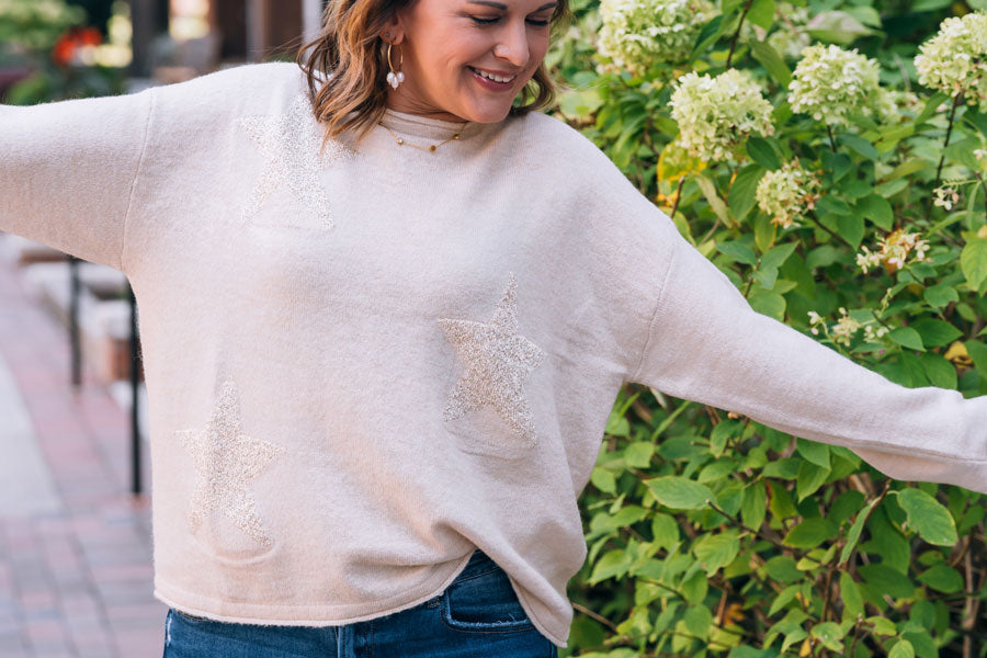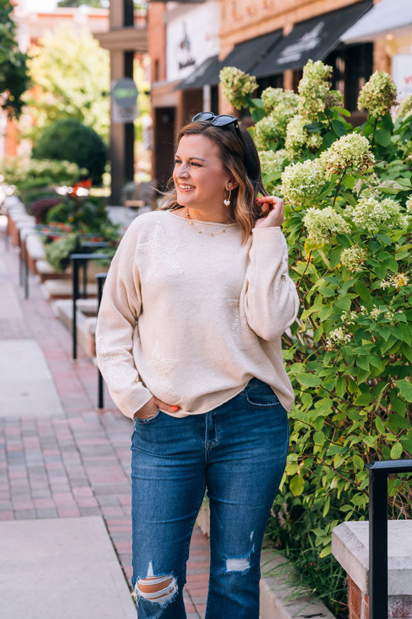 The She's A Star Taupe Sweater brings a subtle sparkle to your wardrobe with delicate embossed stars that add just the right amount of charm. Soft and cozy, it offers warmth without sacrificing comfort, while the dropped sleeves give it a relaxed, playful vibe. Wear with your favorite jeans all fall and winter long!