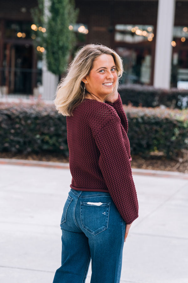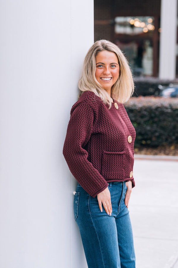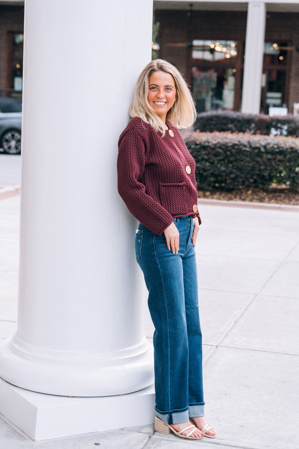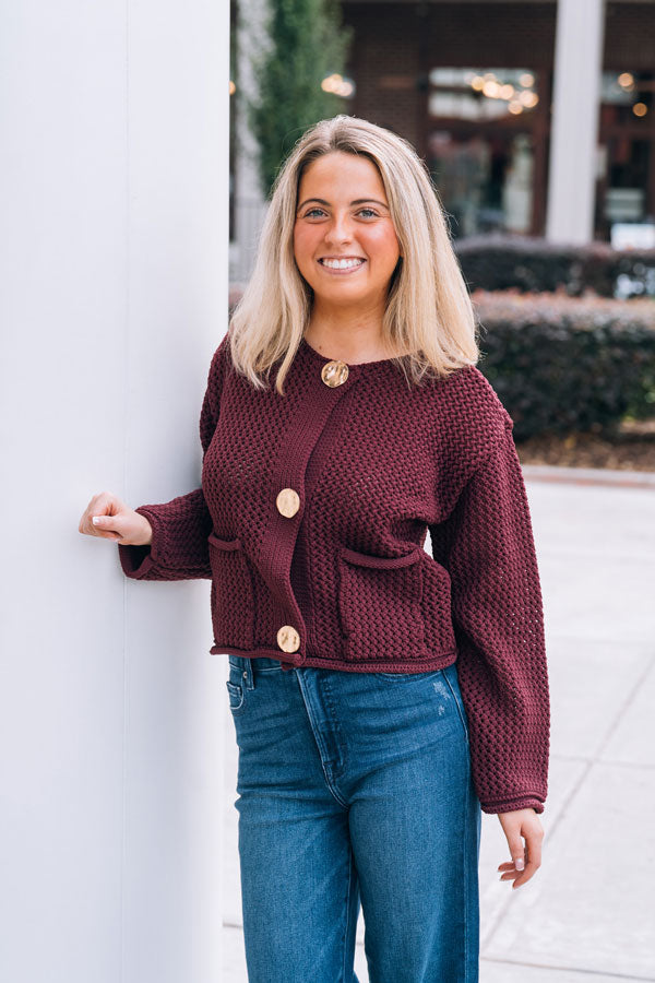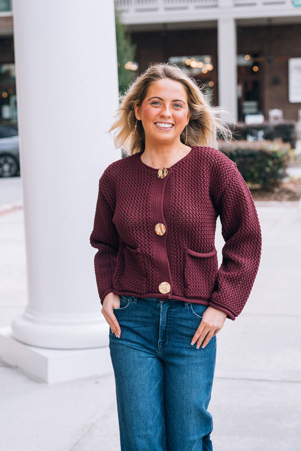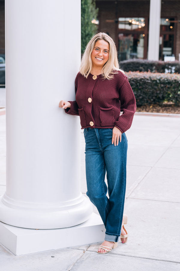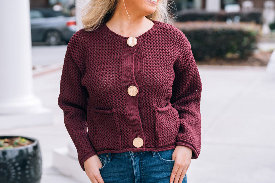 Slip into the Boss Mode Sweater and own your day with playful confidence. This soft plum knit cardigan sweater features flat front pockets, rolled hem and cuffs, and large bold gold buttons. Perfect for dressing up a pair of denim or pairing with a cute trouser for work. We think it would be very chic to wear this cardigan open or just buttoned at the top for a different look!