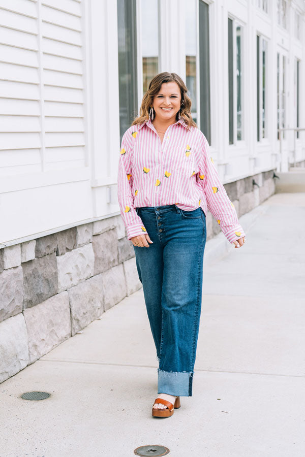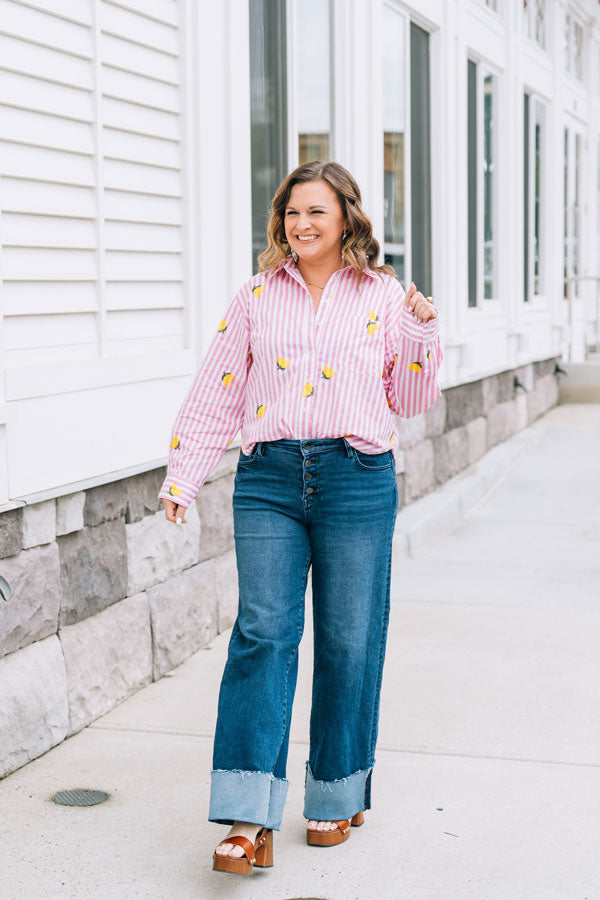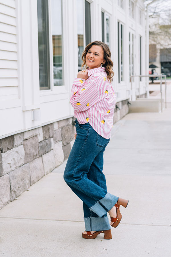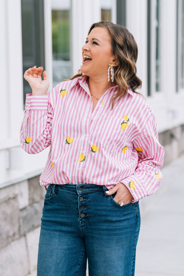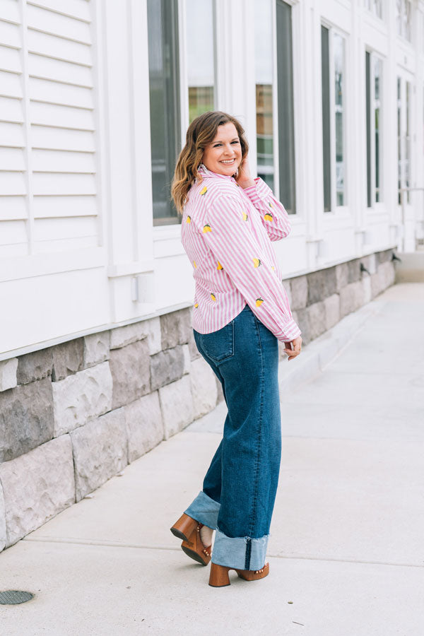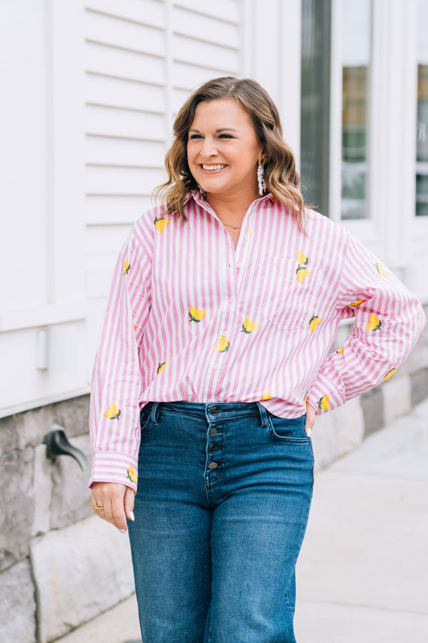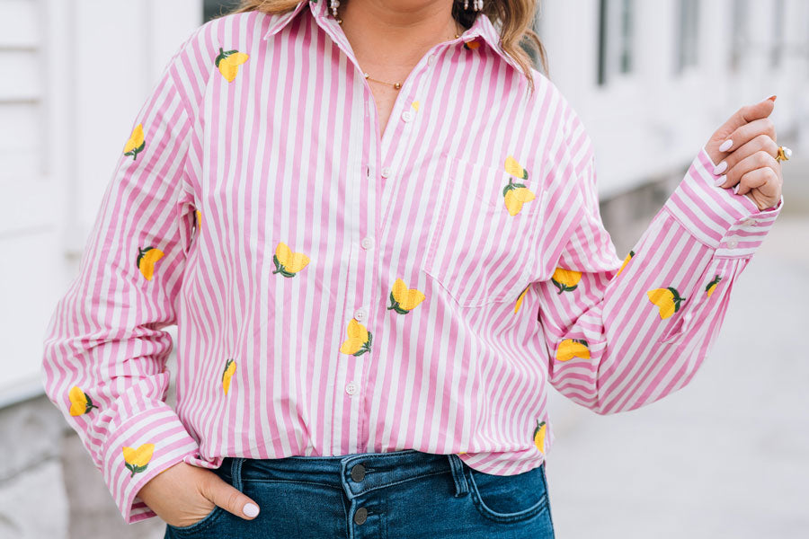 Brighten your spring wardrobe with this charming Pink Lemonade Button-Up. Playful applique lemons dance across the pink & white stripe fabric, bringing a touch of whimsy to your everyday style. Perfect for those who love a little fun with their fashion! Great for casual outings, weekend brunch, or whenever you want to add a splash of color to your look!