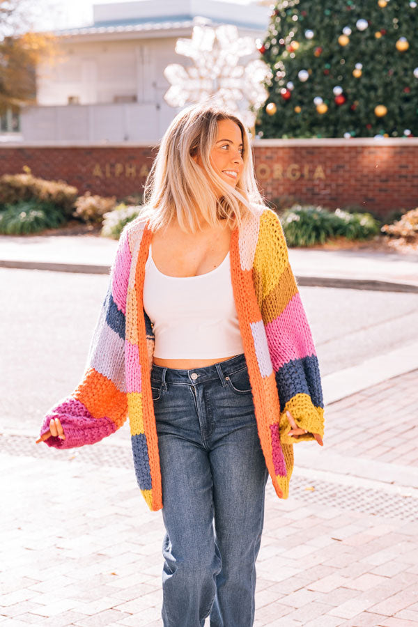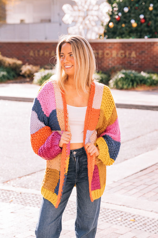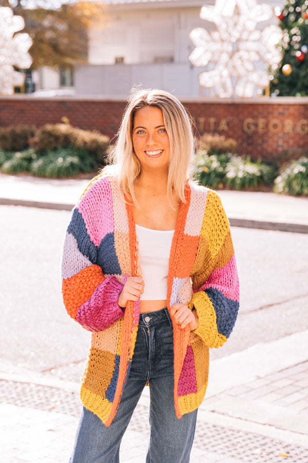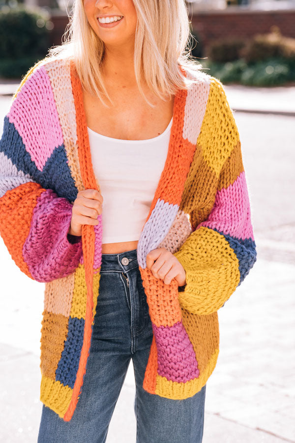 Layer up with energy in the oversized Electric Feels Cardigan that's bursting with personality. Featuring a vibrant patchwork design in a loose, breathable weave, it's the perfect throw-on piece for effortless style. Mix and match colors that pop, drape it over anything, and let your outfit do the talking. Comfort meets bold fashion in one statement-making essential.