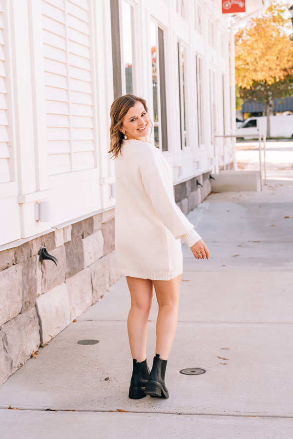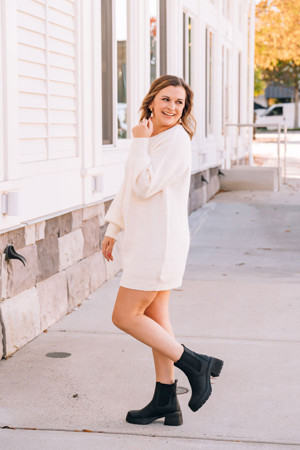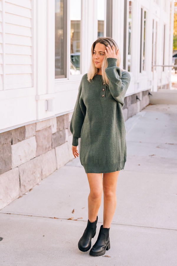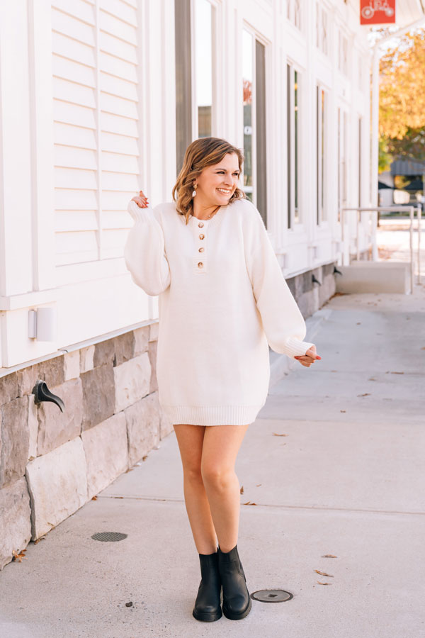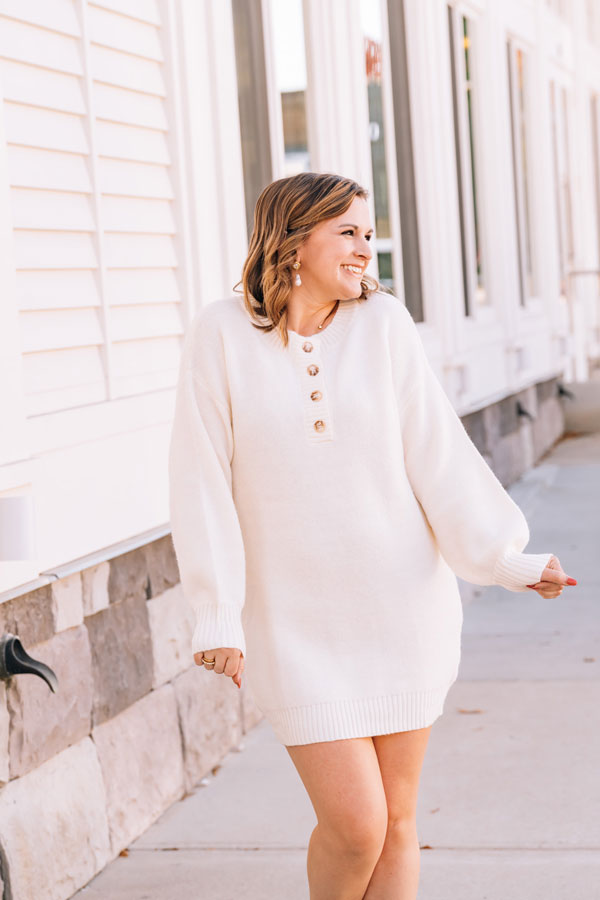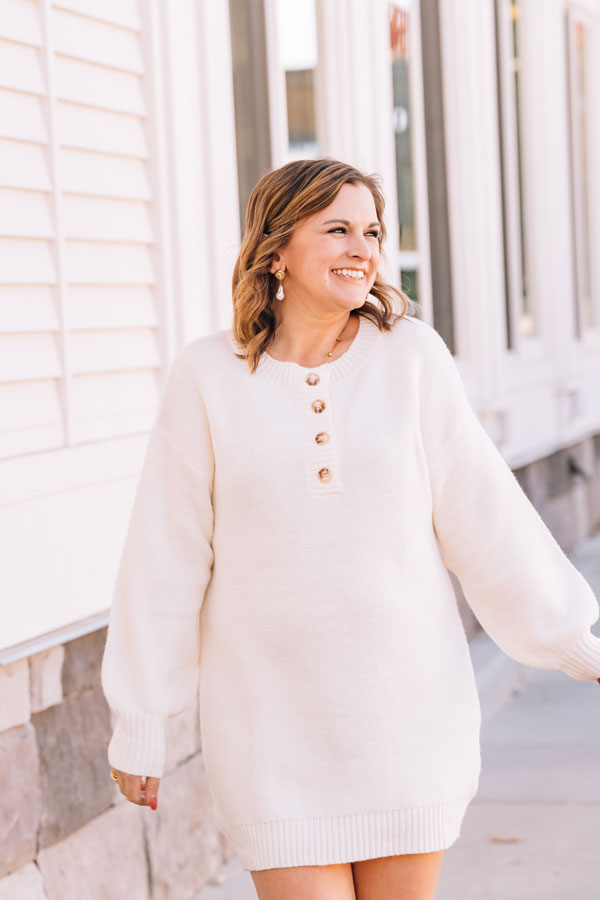 This Falling for You Sweater Dress is your new obsession waiting to happen. Impossibly soft and oh-so-wearable, it pairs a flirty mini length with full sleeves that wrap you in warmth. The timeless Henley neckline keeps things casual and cool, making it the perfect piece. Wear alone or over tights; add your favorite boots or booties to complete the look. We love pairing a long vest over it as shown on Cameron in the Cream color.