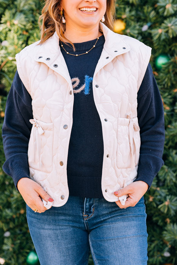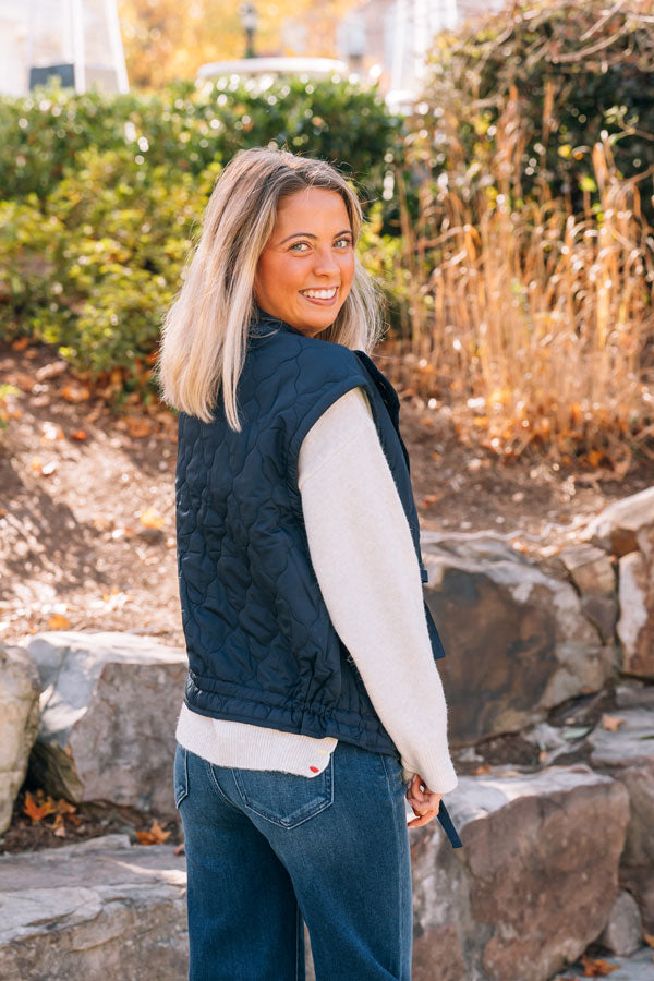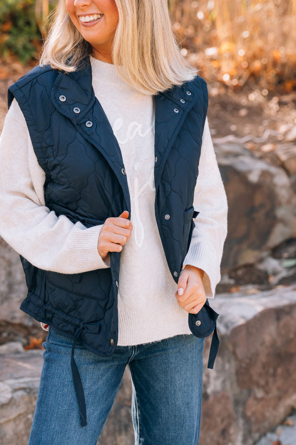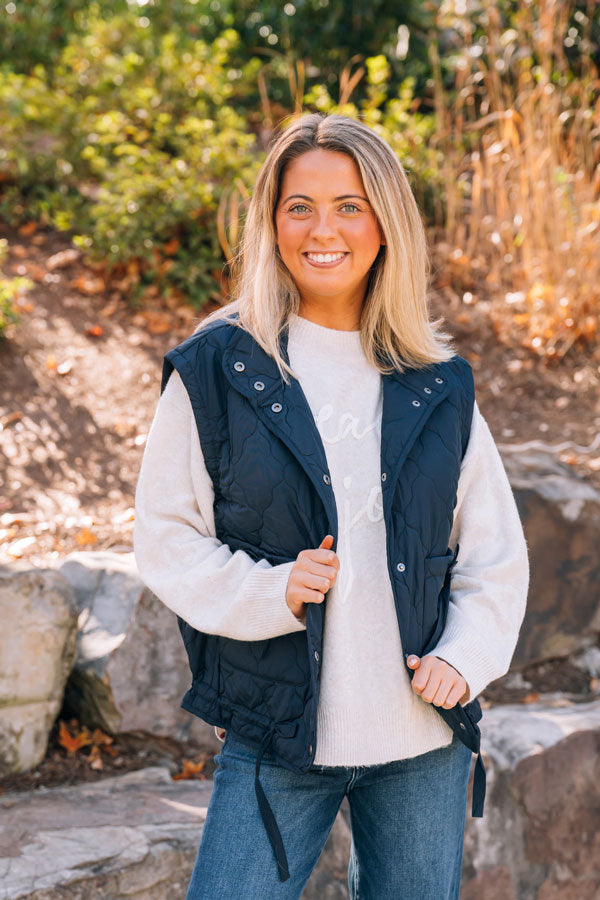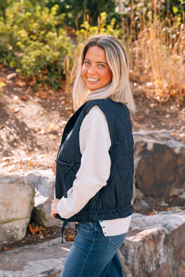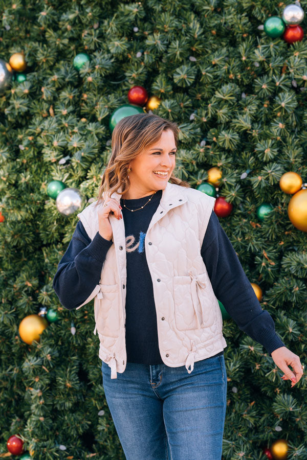 Our adorable Isn't She Cute Quilted Vest is the perfect lightweight layer for any season! Featuring a charming bow cinch at the waist that flatters your silhouette and matching bow details at the pockets, it's as cute as it is functional. Slip it over your favorite long sleeve tee, sweater, or dress to add instant style and warmth without the bulk. The quilted construction keeps you cozy while staying easy to move in, making it ideal for layering through fall and beyond. Comes in Cream, Navy, and Black.
