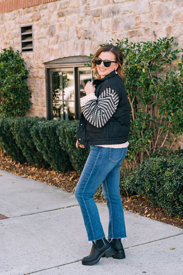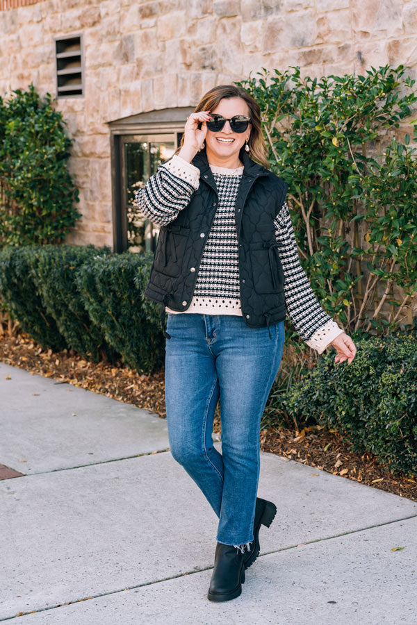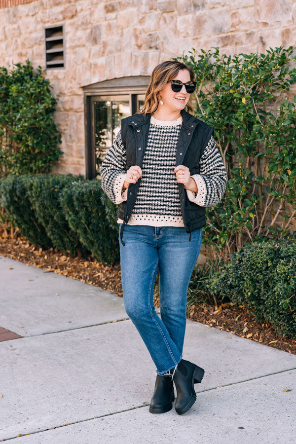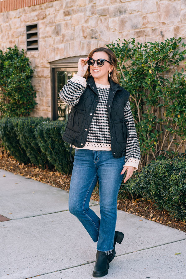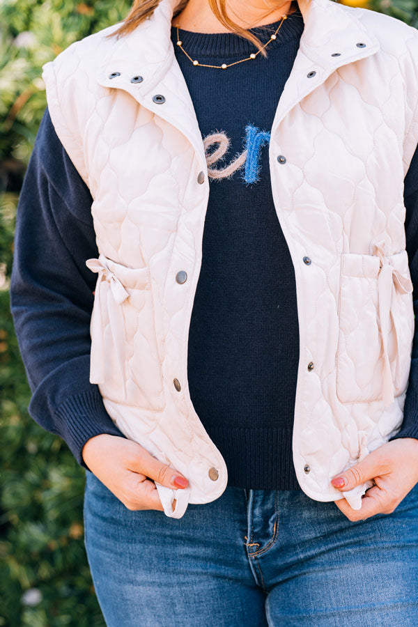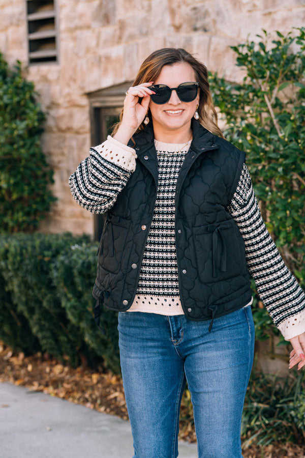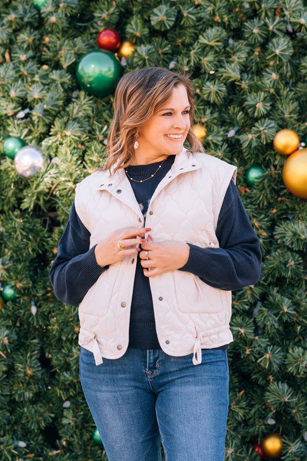 Our adorable Isn't She Cute Quilted Vest is the perfect lightweight layer for any season! Featuring a charming bow cinch at the waist that flatters your silhouette and matching bow details at the pockets, it's as cute as it is functional. Slip it over your favorite long sleeve tee, sweater, or dress to add instant style and warmth without the bulk. The quilted construction keeps you cozy while staying easy to move in, making it ideal for layering through fall and beyond. Comes in Cream, Navy, and Black.