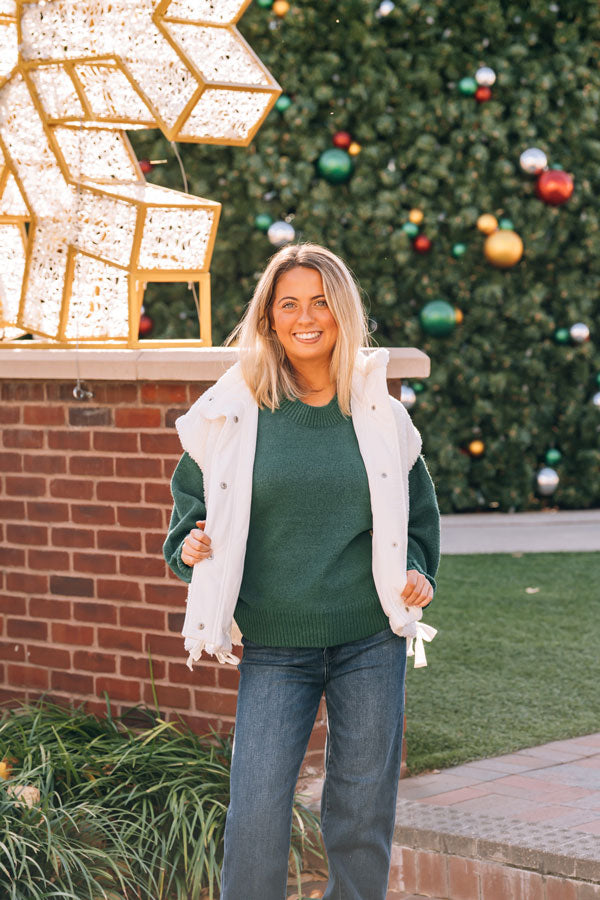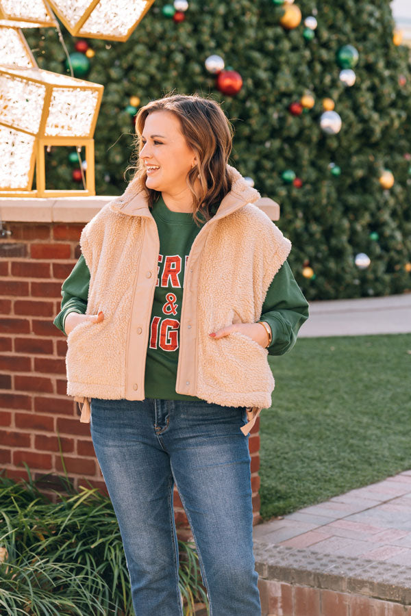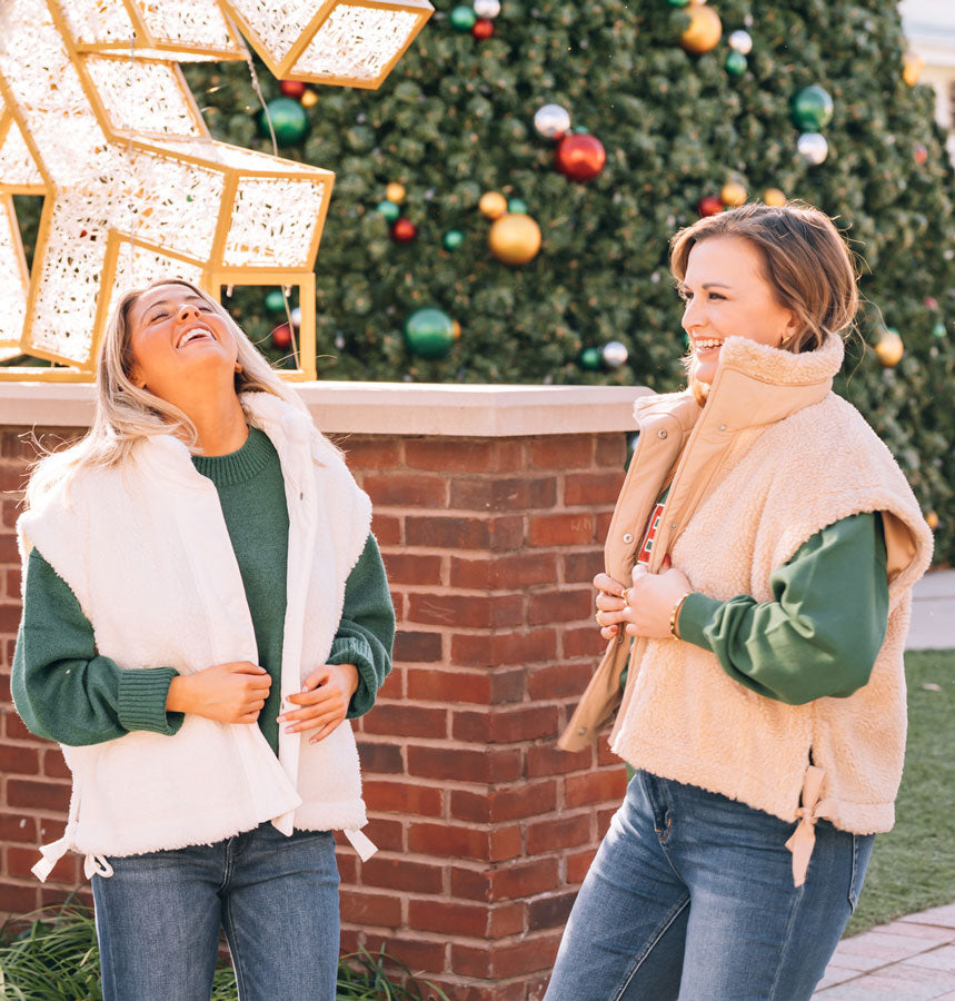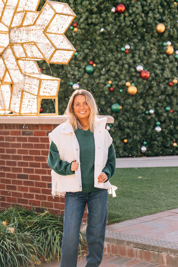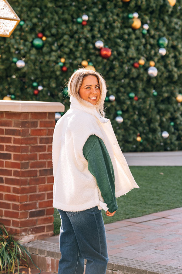 Our Let It Be Sherpa Vest is a cute oversized, boxy beauty that wraps you in cozy sherpa warmth while its roomy cut lets you move freely and layer however you like. The sweet bow detail at the hemline adds a playful finishing touch that elevates any outfit. Lined pockets keep your hands warm! Whether you're running errands, cozying up indoors, or heading out for adventure, this versatile vest is ready for whatever comes your way. Comes in White and Beige.