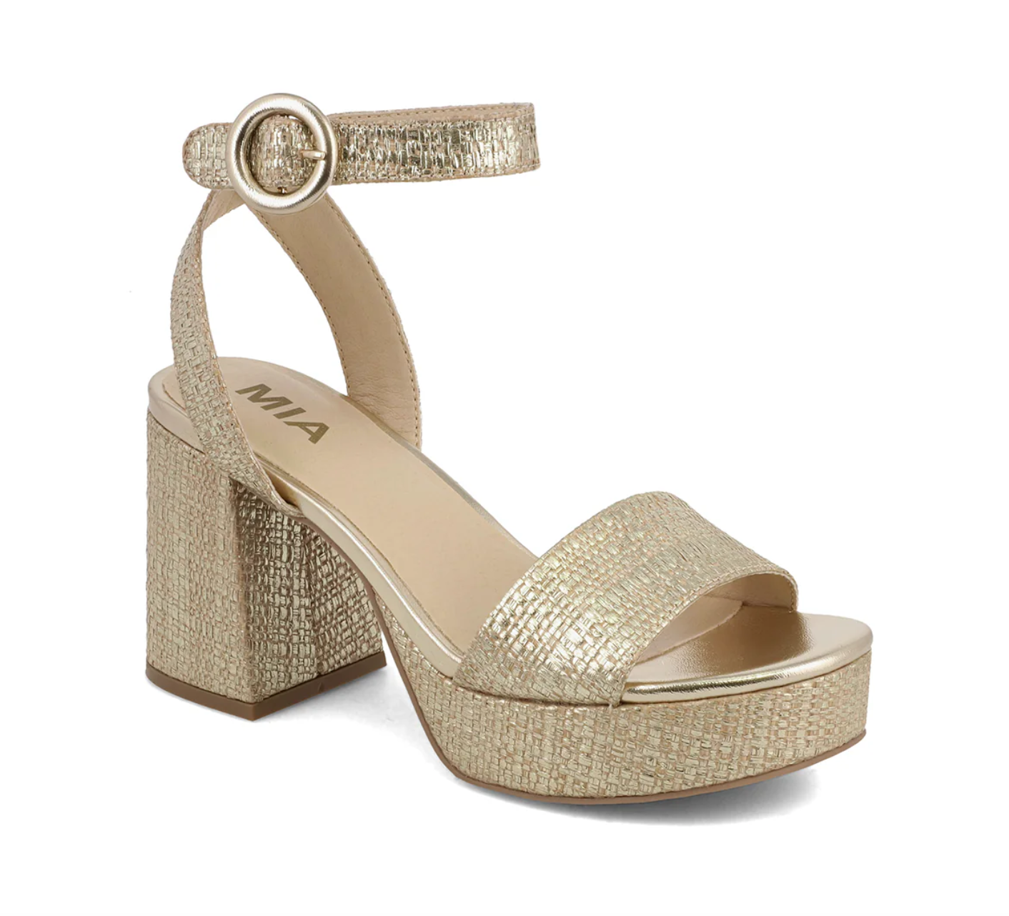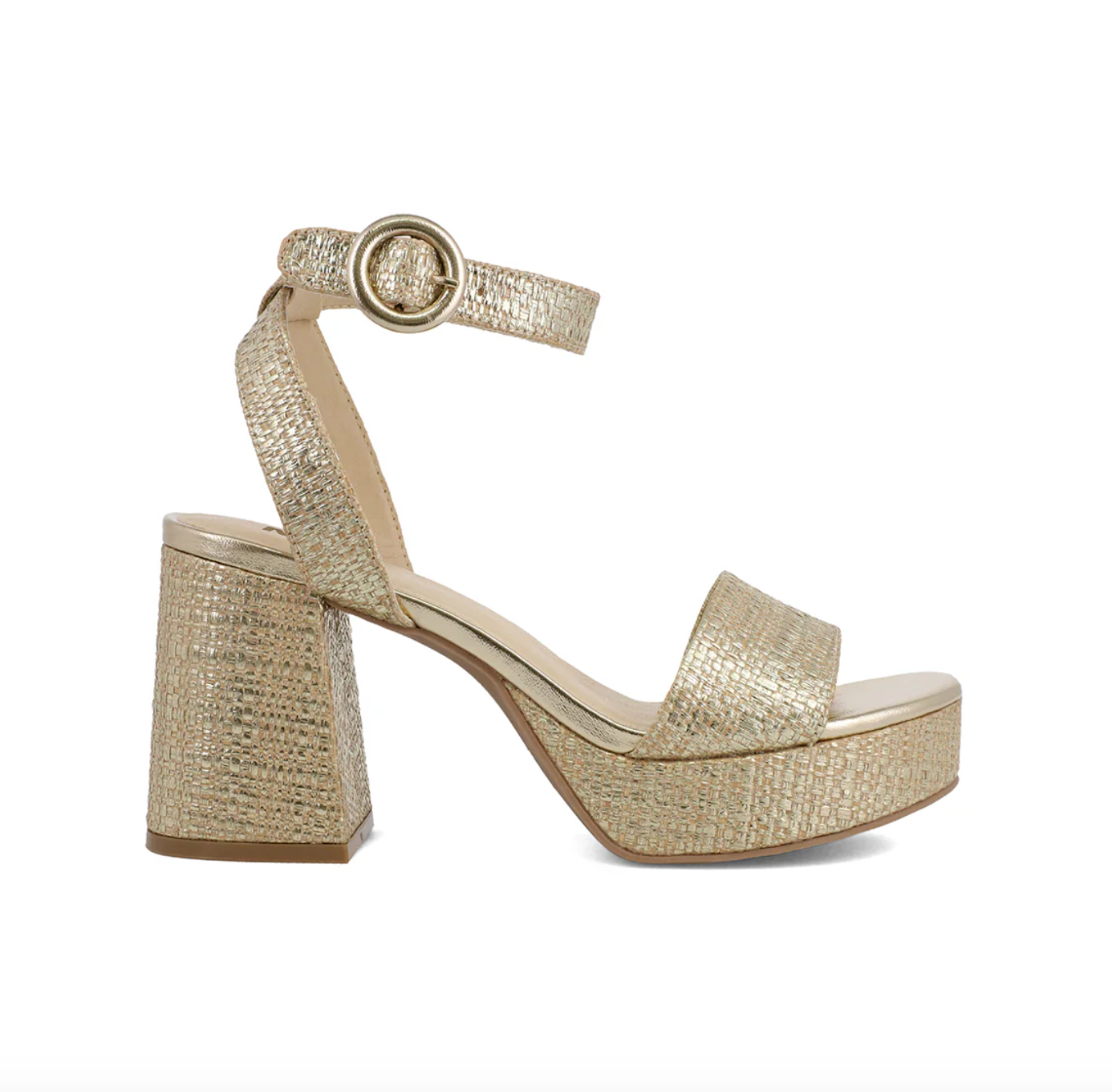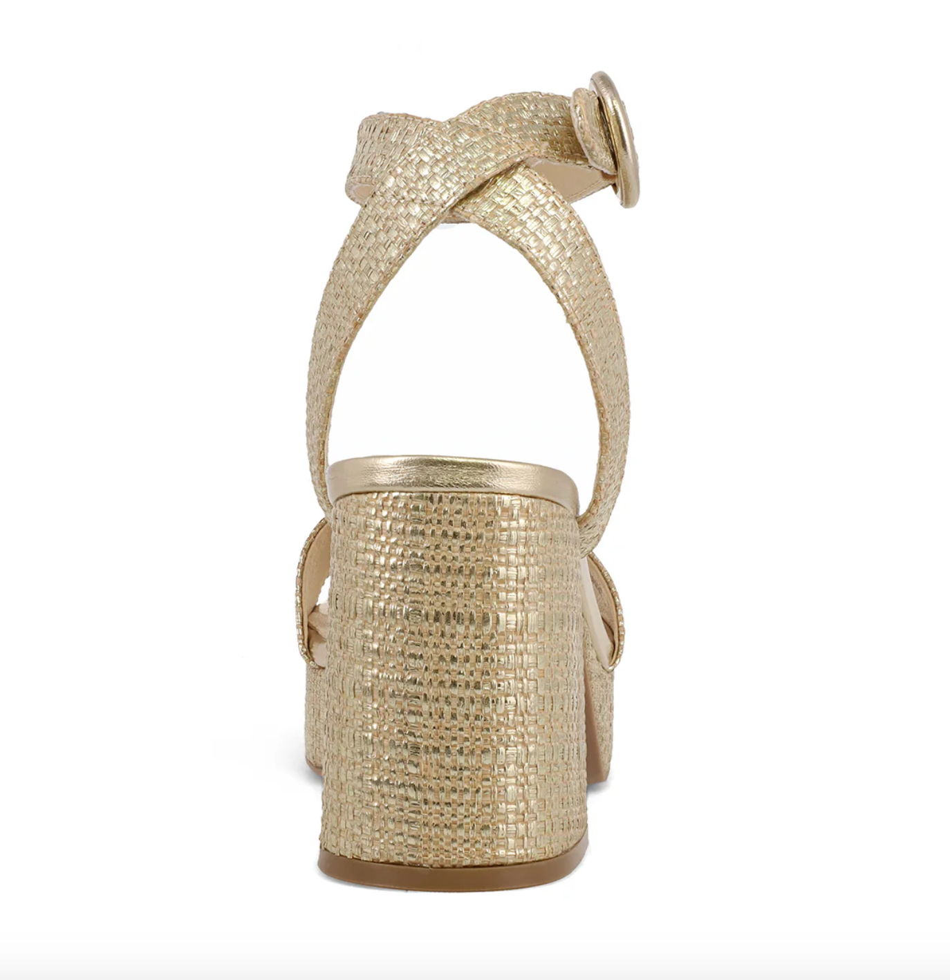 The Renee Platform Heel is here for all your spring and summer outings. This metallic block-heel platform sandal is crafted from raffia and vegan leather, stands 3.7 inches tall and features an adjustable ankle strap for the perfect fit.