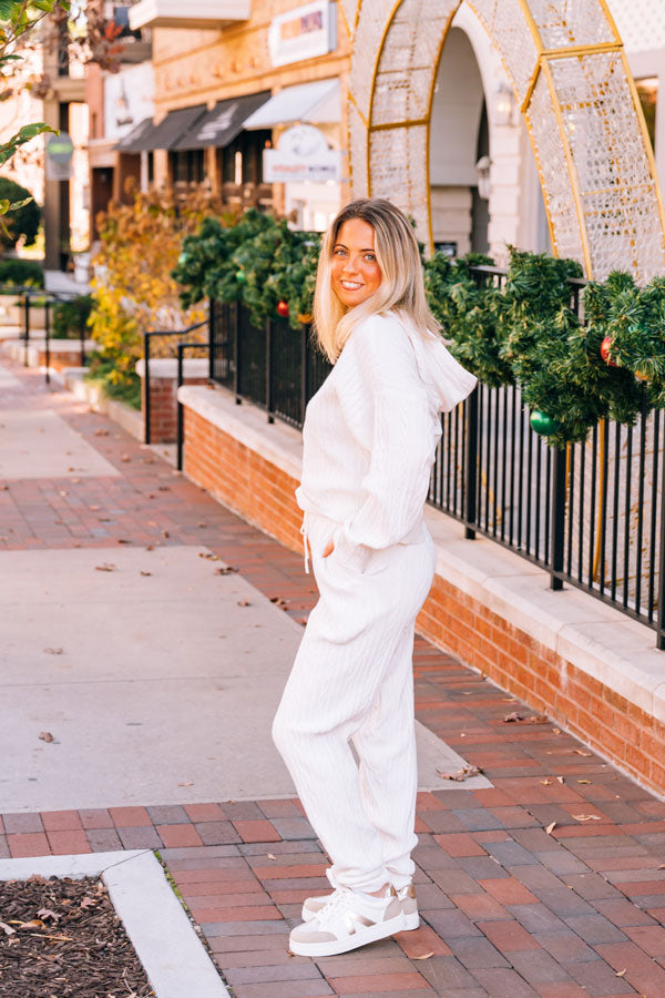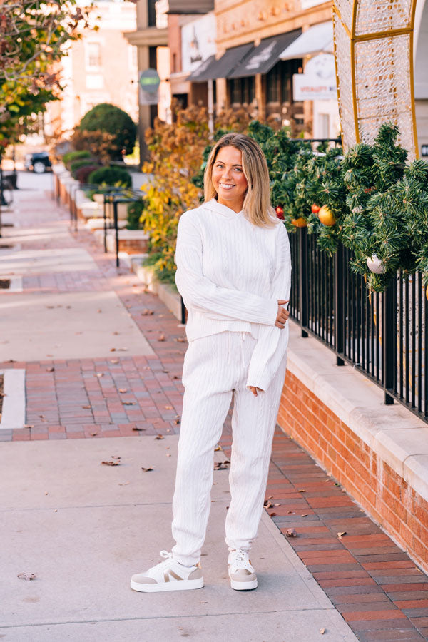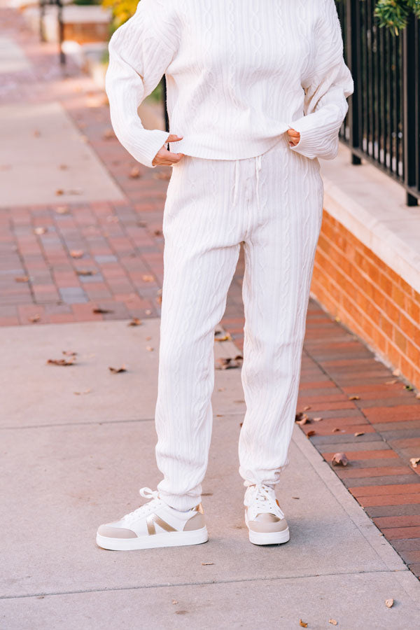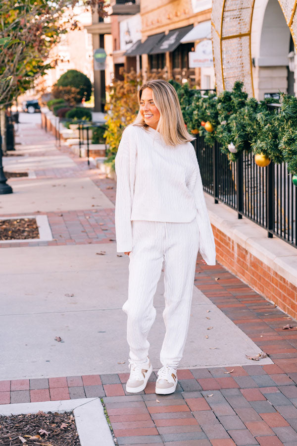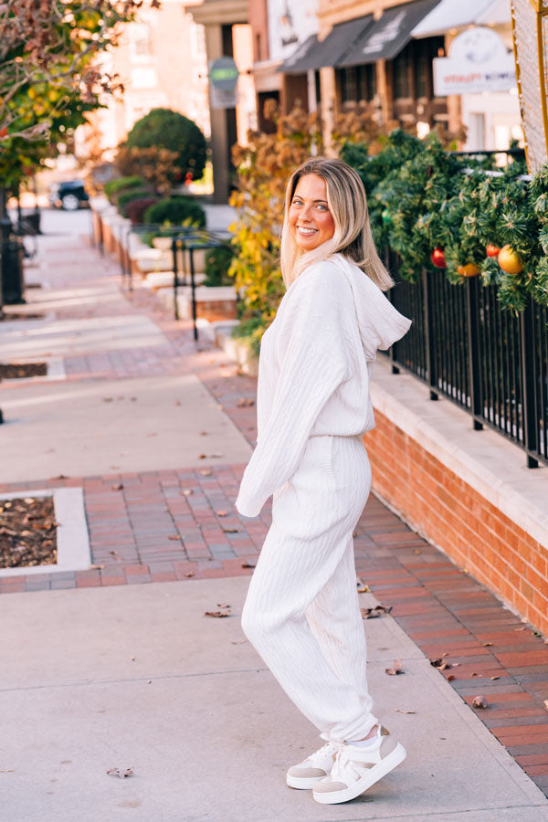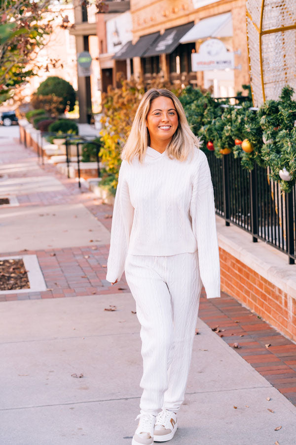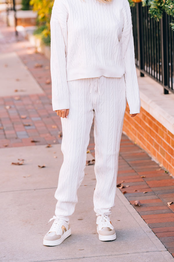 Cozy up in the softest sweatpants, our Winter Wonderland Sweatpants! These winter white cable knit joggers are super soft and so stretchy, perfect for relaxing at home, traveling this holiday season, or out for the day!